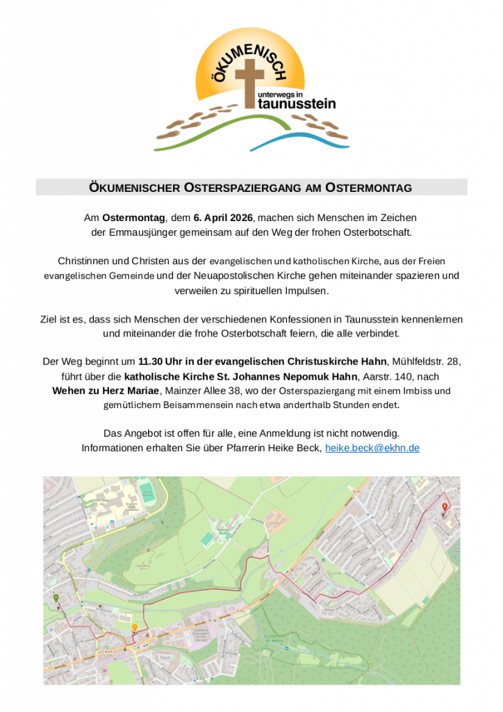 Ostermontag 2025 ging der Weg durch den Stadtteil Neuhof und alle Teilnehmerinnen und Teilnehmer waren mit großer Freude unterwegs. Am Ostermontag 2026 beginnt der gemeinsame Weg um 11:30 Uhr an der evangelischen Christuskirche in Hahn, Mühlfeldstr. 28, und führt über die katholische Kirche St. Johannes Nepomuk, ebenfalls in Hahn, Aarstr. 140. Von da geht es gemächlichen Schrittes, damit jeder auch mitkommt, nach Wehen zu Herz Mariae, Mainzer Allee 38, wo der Osterspaziergang mit einem kleinen Essen und gemütlichem Beisammensein nach etwa anderthalb Stunden endet. Da können wir uns mit Getränken und einem Imbiss stärken und weiter miteinander ins Gespräch kommen bei hoffentlich trockenem Wetter und etwas Sonnenschein.